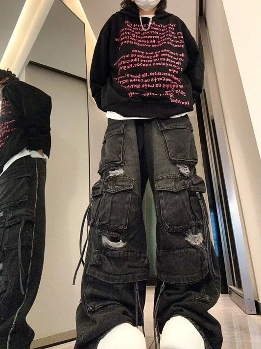 Women's Y2K Ripped High-Waisted Wide-Leg Cargo Jeans