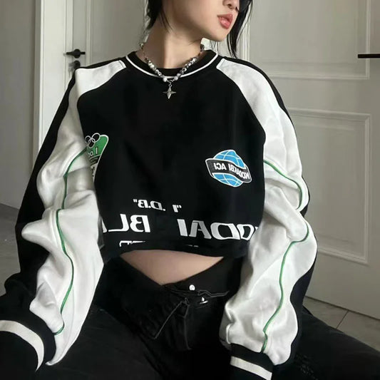 Y2K Letter Print Crop Sweatshirt Women Spring Fashion Patchwork Hoodie