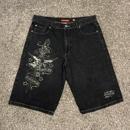 Y2K Letter Print Black Denim Gym Shorts