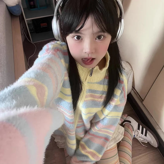 Y2K Striped Knitted Cardigan Women Vintage Oversized Winter Outfit