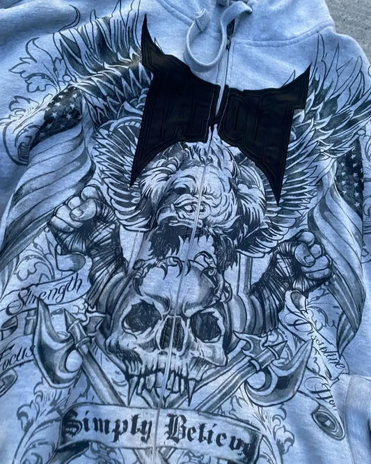 Y2K Vintage Fashion Skull Print Zip Up Hoodie Autumn Winter Men