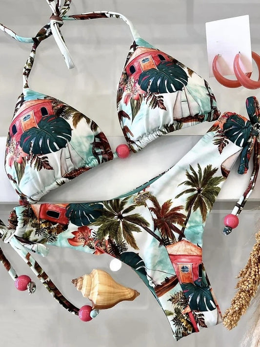 2024 Sexy Print Women's Swimsuit Braiding rope Bandage Bikinis Set Triangle