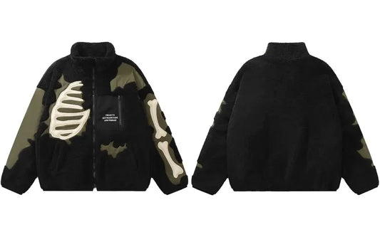 Hip Hop Fleece Jacket Embroidery Skull Skeleton Bones Thick Men Jackets