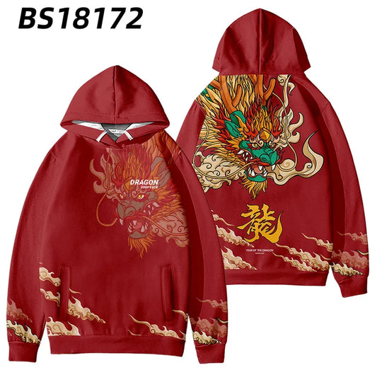 Men Streetwear Harajuku Pullover Anime Flame Dragon Printed Hoodie Pocket Fleece
