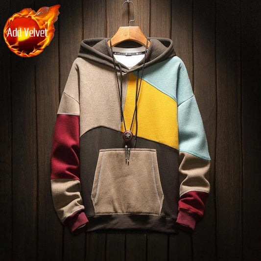 Winter Fleece Hoodies Sweatshirt Men Hip Hop Color Block Patchwork Pullover Hoodie Streetwear Tops Oversize