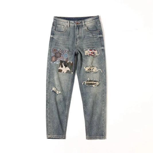 Ripped Patch Jeans Men Retro Streetwear Straight Trousers
