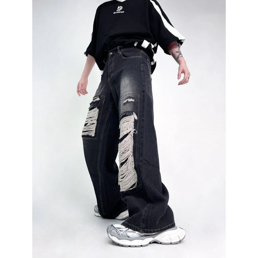 2024 Hip Hop Punk Patchwork Ripped Rock Goth Y2k Wide Leg Length Denim Streetwear