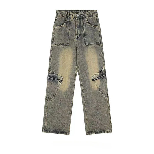 American Retro Washed Distressed Multi-Pocket Jeans Hip-Hop