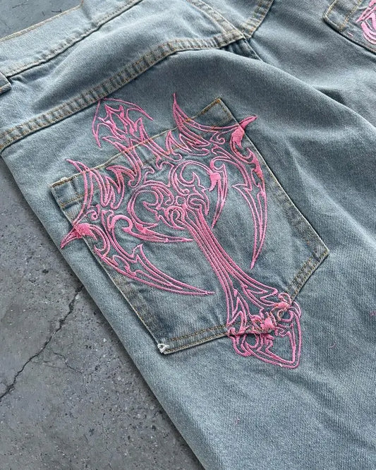 Mens Baggy Jeans Y2k Harajuku Pattern Black Loose Casual Wide Leg Pants