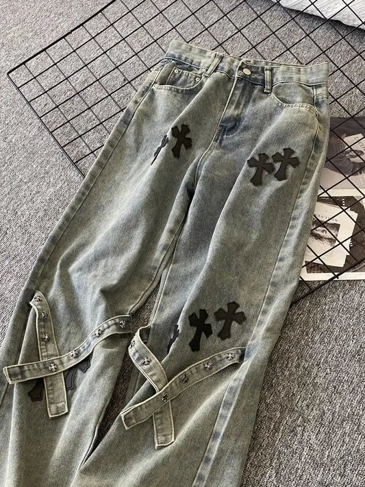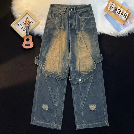 Men's Hip Hop Patchwork Jeans Washed Loose Straight Retro Denim Pants