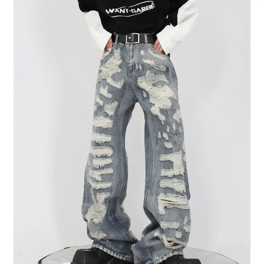Men High Street Distressed Jeans Loose Straight Hip Hop Pants