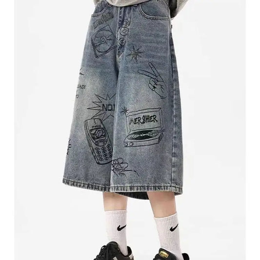 American Retro Y2K Gothic Washed Wide Leg Jeans Men’s Loose Shorts