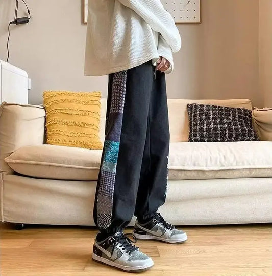 Men's Vintage Spliced Pants Loose Fit Casual Joggers Autumn Winter