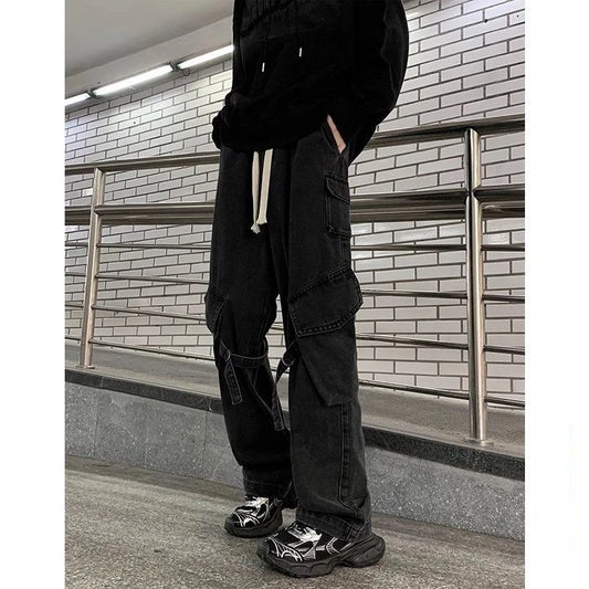 Men's Black Baggy Cargo Jeans Streetwear Wide Leg Oversize Denim Pants
