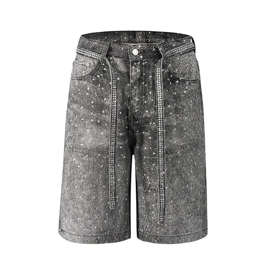 Men's Rhinestone Baggy Denim Shorts Wide-Leg Loose Five-Point Jeans
