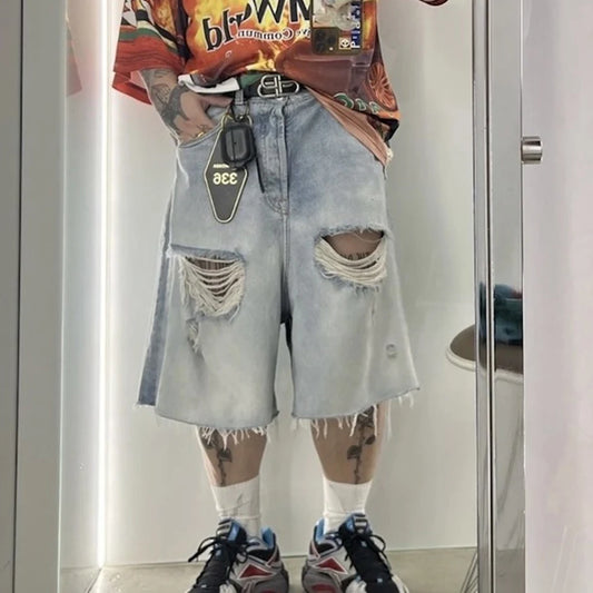 Men's Vintage Light Blue Ripped Baggy Denim Shorts Wide Leg Jeans