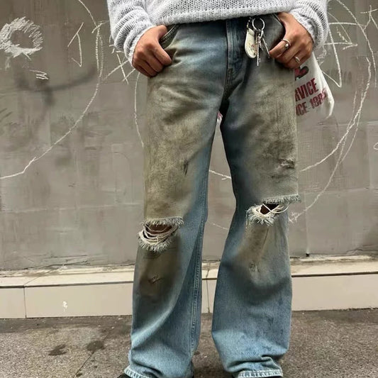 Distressed Mud-Dyed Men Baggy Jeans Vintage Streetwear