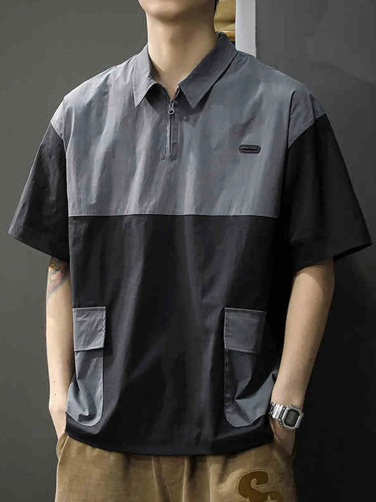 Mens Cargo Pocket Polo Shirt Half Zip Patchwork Casual Tee 2026