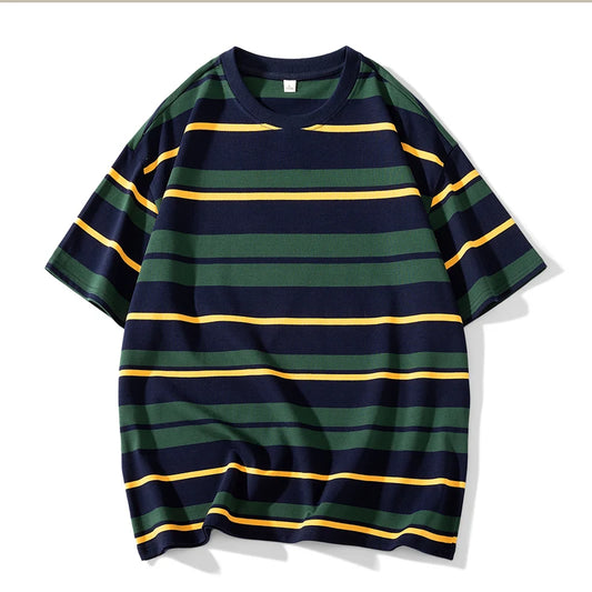Men's Striped Cartoon Embroidery Vintage Relaxed Fit Cotton T-Shirt