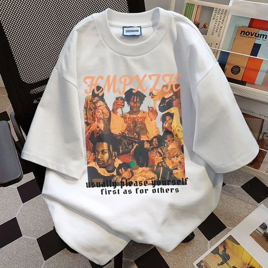 Men's American Hip-Hop Street Retro Print Loose Casual T-Shirt