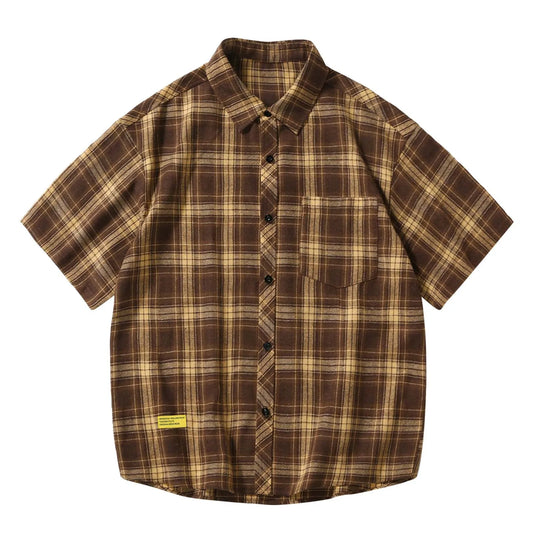 Men’s Japanese Vintage Plaid Short Sleeve Button Down Beach Shirt
