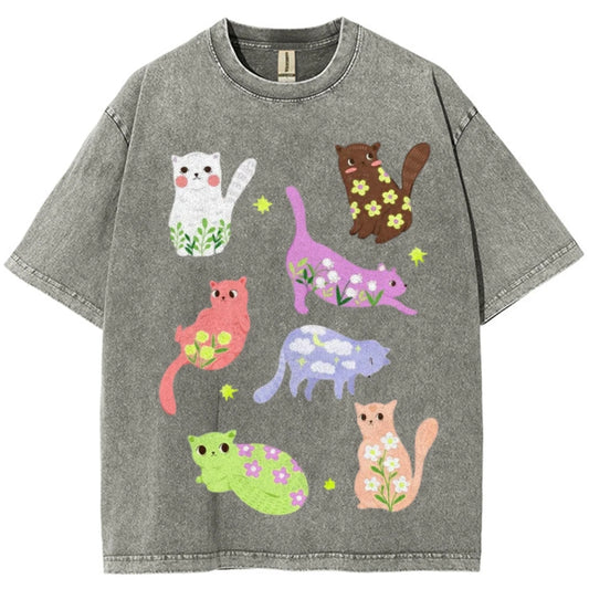 Colorful Cat Print Summer Water Wash Vintage Men's Casual T-Shirt