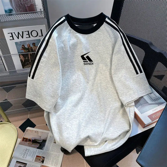 2024 Summer American Unisex Fashion Letter Print Stripe Short Sleeved Design Casual