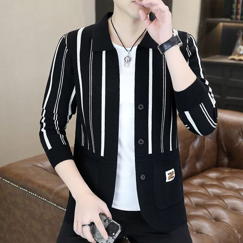 Mens Striped Knit Cardigan Brocade Sweater Cloak Cotton Outwear