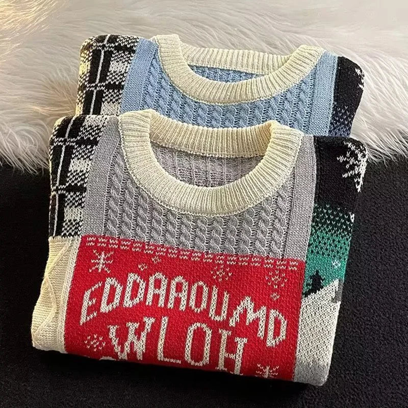 Mens Twist Jacquard Knit Sweater Vintage Pattern Crew Neck