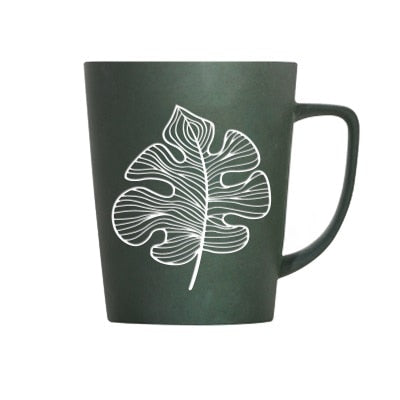 Leaf Pattern Ceramic Coffee Mug With Lid Spoon Large Capacity