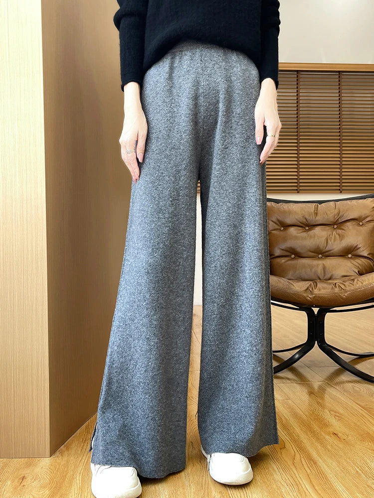 Womens Merino Wool Pants Flared Knit Trousers Elastic Waist Office