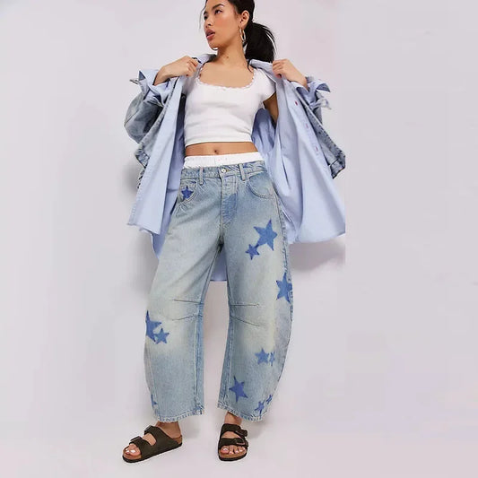 Y2K Printed Denim Pants Women's Loose Low Waist Street Trousers