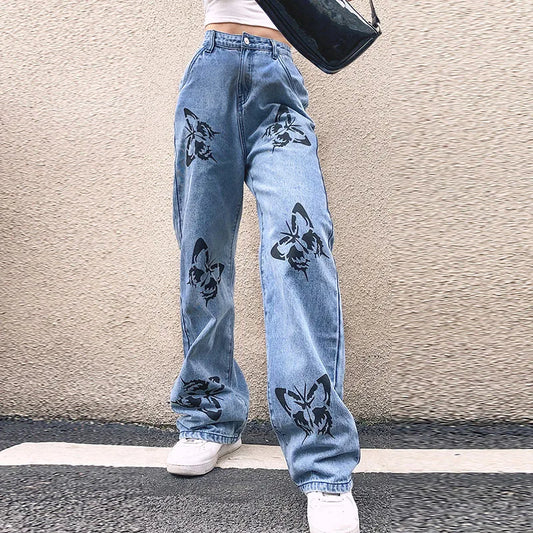 Street Chic Butterfly Print Jeans Women's High Waist Denim Pants