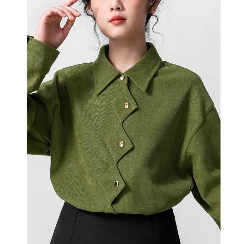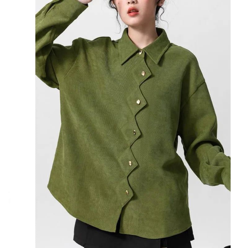 Green Irregular Shirt Women Vintage Collar Long Sleeve Button Top