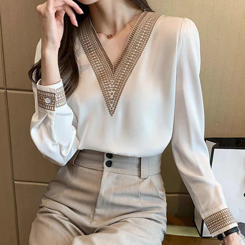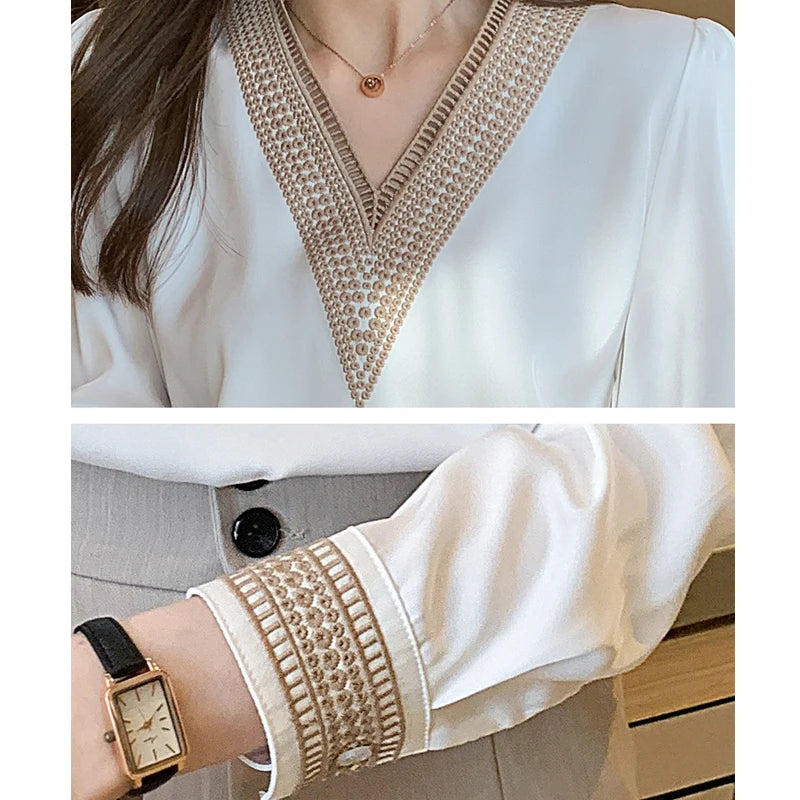 Womens White Chiffon Blouse V Neck Long Sleeve Work Casual Top