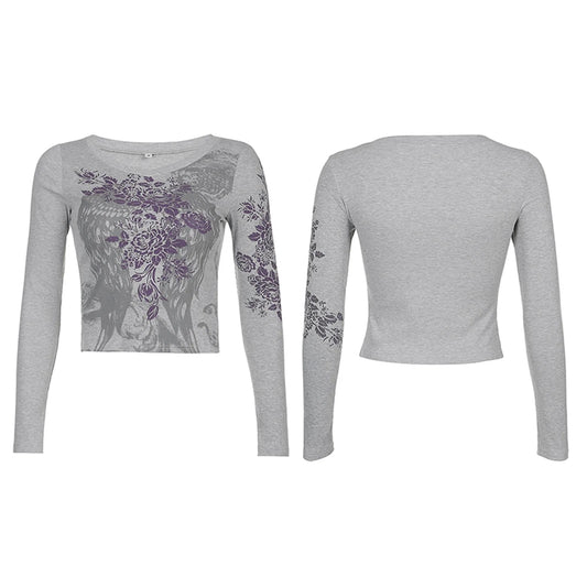 Women's Vintage Gothic Floral Print Slim Fit V-Neck Grunge Tee