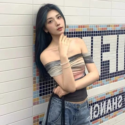 Women’s Tie-Dye Mesh Sheer Off Shoulder Crop Top Summer Tee