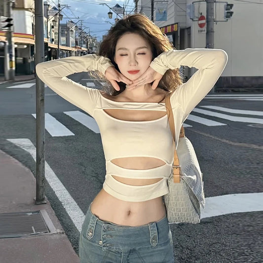 Women's Y2K Off Shoulder Cutout Cropped Top Slim Fit Coquette Tee