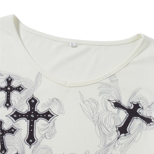 Women’s Gothic Vintage Rhinestone Cross Wing Print Slim T-Shirt
