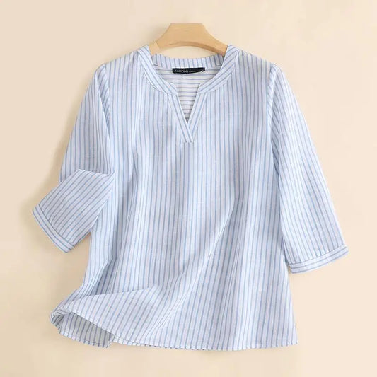 Women Elegant Summer Striped Shirt Autumn V Neck 3/4 Sleeve Blouse
