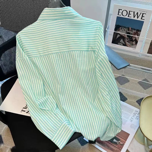 Women's Striped Print Blouse Loose Lapel Long Sleeve Single Breasted
