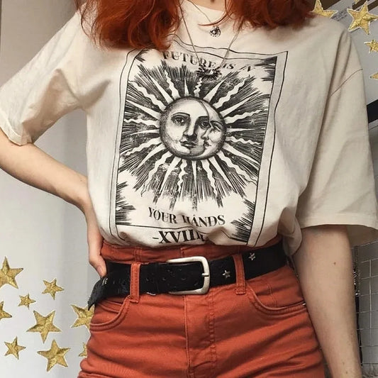 Sun & Moon Print T-Shirt Beige Vintage Grunge Aesthetic Tee