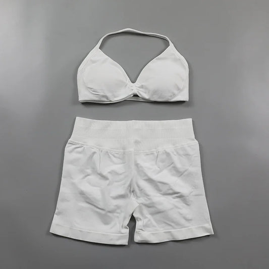 Ruched Seamless Yoga Set Women 2 Piece Halter Bra and Gym Shorts Outfit