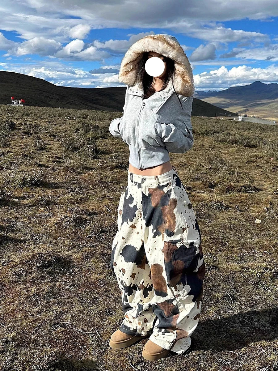 Cow Print Barrel Jeans Women Fleece Lined Wide Leg Low Rise Pants