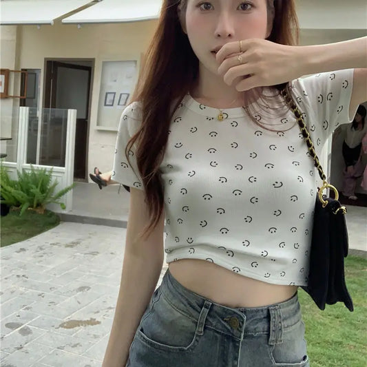 2024 Smiling Face Crop Top Y2K Cute Tee Women