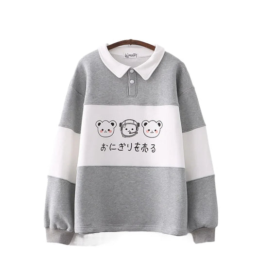 2023 Herbst Kawaii Cartoon Bär Sweatshirt – Fleece, gefälschter Zweiteiler mit Umlegekragen