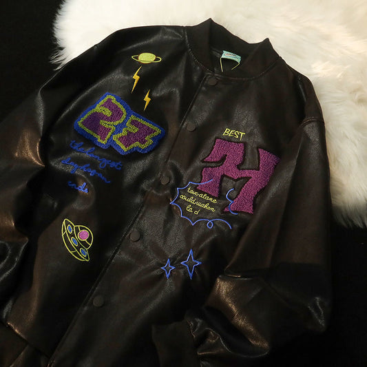 American Retro Letter Print Leder Baseballjacke Herren Streetwear