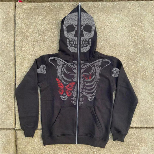 Trendy Y2K Skeleton Skull Sparkly Hoodie Gothic Rhinestone Butterfly Zip Up