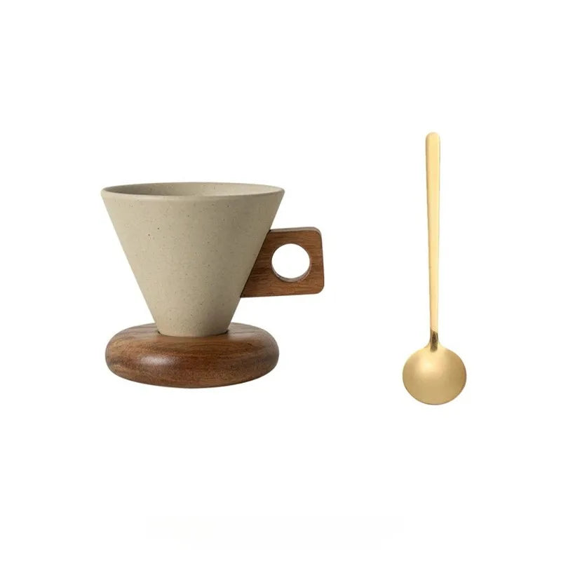 Ceramic Coffee Cup Retro Conical Wood Base Handle Heat Proof Tea Set