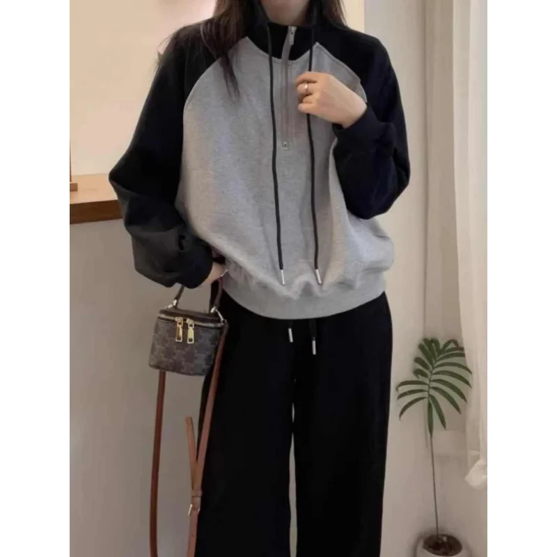 Womens Half Zip Crop Sweatshirt Raglan Sleeve Stand Collar Grey Top